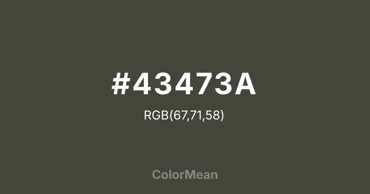 #43473A RGB value is (67, 71, 58). The hex color red value is 67, green is 71, and blue is 58. Its HSL format shows a hue of 78°, saturation of 10 percent, and lightness of 25 percent. The CMYK process values are 6 percent, 0 percent, 18 percent, 72 percent.