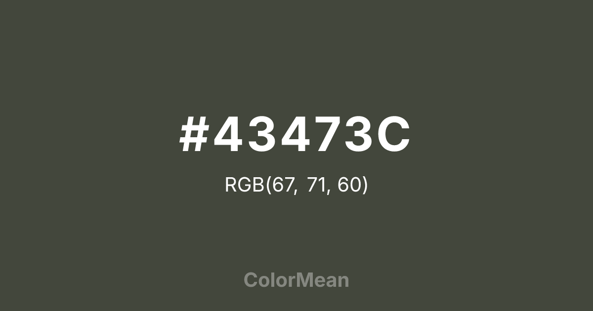 #43473C RGB value is (67, 71, 60). The hex color red value is 67, green is 71, and blue is 60. Its HSL format shows a hue of 82°, saturation of 8 percent, and lightness of 26 percent. The CMYK process values are 6 percent, 0 percent, 15 percent, 72 percent.