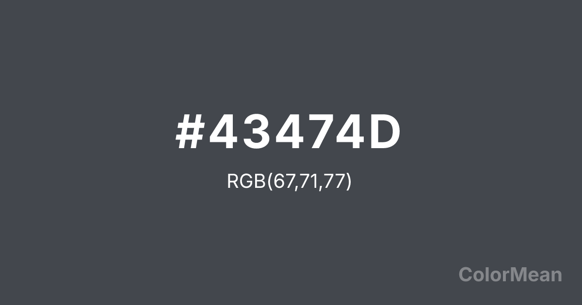 #43474D RGB value is (67, 71, 77). The hex color red value is 67, green is 71, and blue is 77. Its HSL format shows a hue of 216°, saturation of 7 percent, and lightness of 28 percent. The CMYK process values are 13 percent, 8 percent, 0 percent, 70 percent.