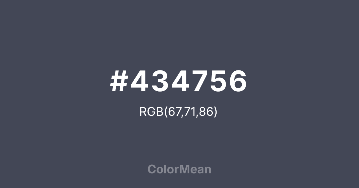 #434756 RGB value is (67, 71, 86). The hex color red value is 67, green is 71, and blue is 86. Its HSL format shows a hue of 227°, saturation of 12 percent, and lightness of 30 percent. The CMYK process values are 22 percent, 17 percent, 0 percent, 66 percent.