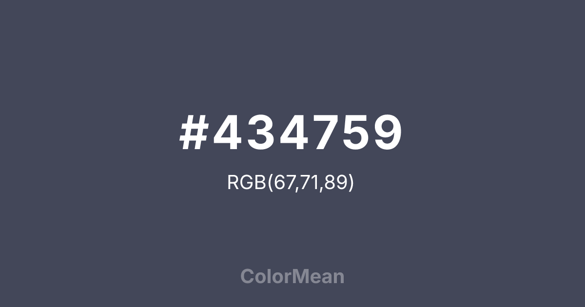 #434759 RGB value is (67, 71, 89). The hex color red value is 67, green is 71, and blue is 89. Its HSL format shows a hue of 229°, saturation of 14 percent, and lightness of 31 percent. The CMYK process values are 25 percent, 20 percent, 0 percent, 65 percent.