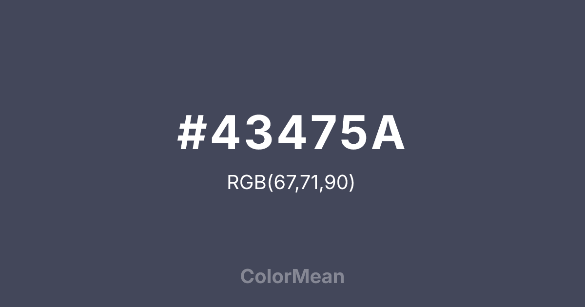#43475A RGB value is (67, 71, 90). The hex color red value is 67, green is 71, and blue is 90. Its HSL format shows a hue of 230°, saturation of 15 percent, and lightness of 31 percent. The CMYK process values are 26 percent, 21 percent, 0 percent, 65 percent.