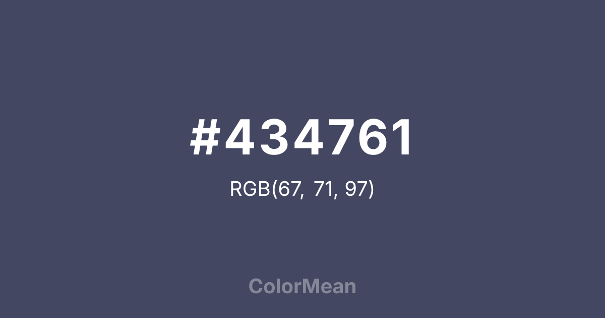 #434761 RGB value is (67, 71, 97). The hex color red value is 67, green is 71, and blue is 97. Its HSL format shows a hue of 232°, saturation of 18 percent, and lightness of 32 percent. The CMYK process values are 31 percent, 27 percent, 0 percent, 62 percent.