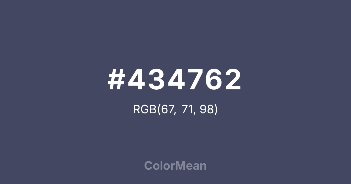 #434762 RGB value is (67, 71, 98). The hex color red value is 67, green is 71, and blue is 98. Its HSL format shows a hue of 232°, saturation of 19 percent, and lightness of 32 percent. The CMYK process values are 32 percent, 28 percent, 0 percent, 62 percent.