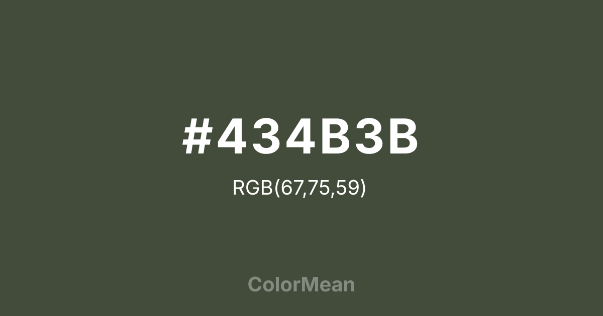 #434B3B RGB value is (67, 75, 59). The hex color red value is 67, green is 75, and blue is 59. Its HSL format shows a hue of 90°, saturation of 12 percent, and lightness of 26 percent. The CMYK process values are 11 percent, 0 percent, 21 percent, 71 percent.