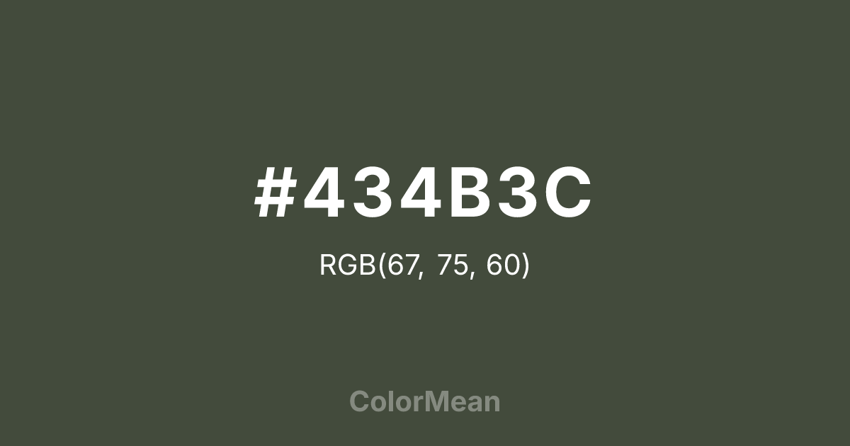 #434B3C RGB value is (67, 75, 60). The hex color red value is 67, green is 75, and blue is 60. Its HSL format shows a hue of 92°, saturation of 11 percent, and lightness of 26 percent. The CMYK process values are 11 percent, 0 percent, 20 percent, 71 percent.