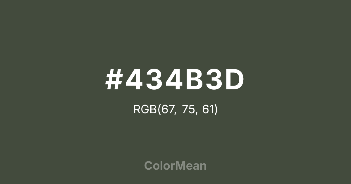 #434B3D RGB value is (67, 75, 61). The hex color red value is 67, green is 75, and blue is 61. Its HSL format shows a hue of 94°, saturation of 10 percent, and lightness of 27 percent. The CMYK process values are 11 percent, 0 percent, 19 percent, 71 percent.
