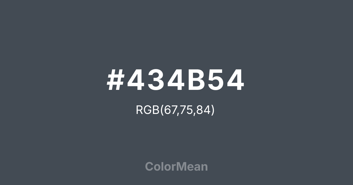 #434B54 RGB value is (67, 75, 84). The hex color red value is 67, green is 75, and blue is 84. Its HSL format shows a hue of 212°, saturation of 11 percent, and lightness of 30 percent. The CMYK process values are 20 percent, 11 percent, 0 percent, 67 percent.