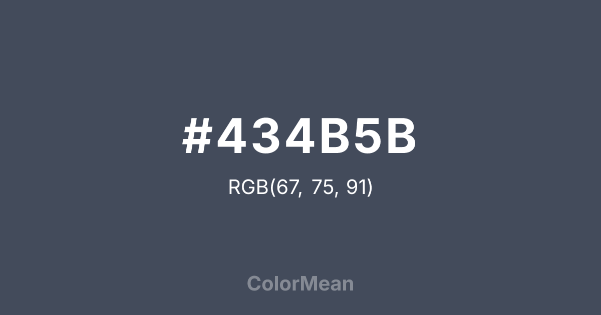 #434B5B RGB value is (67, 75, 91). The hex color red value is 67, green is 75, and blue is 91. Its HSL format shows a hue of 220°, saturation of 15 percent, and lightness of 31 percent. The CMYK process values are 26 percent, 18 percent, 0 percent, 64 percent.