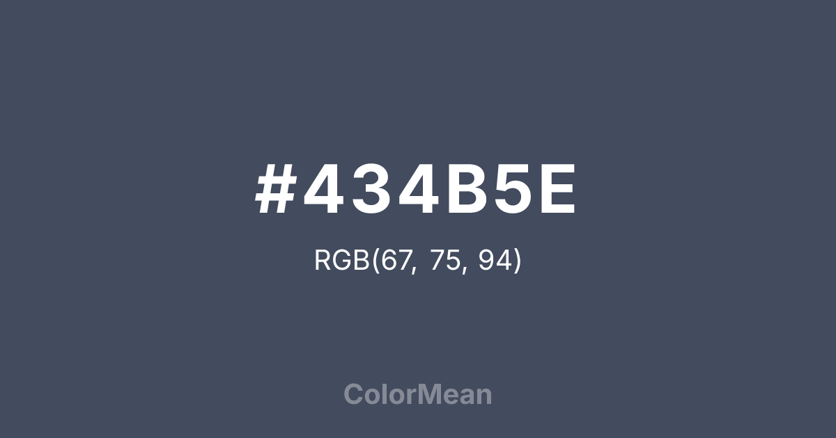 #434B5E RGB value is (67, 75, 94). The hex color red value is 67, green is 75, and blue is 94. Its HSL format shows a hue of 222°, saturation of 17 percent, and lightness of 32 percent. The CMYK process values are 29 percent, 20 percent, 0 percent, 63 percent.