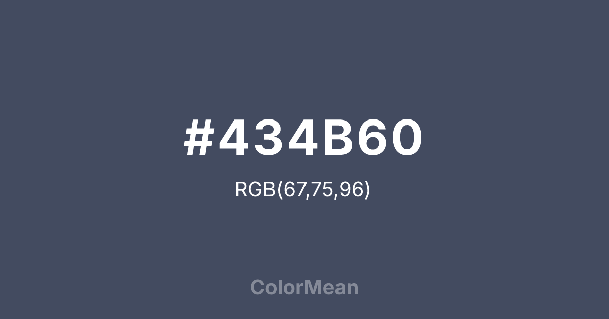 #434B60 RGB value is (67, 75, 96). The hex color red value is 67, green is 75, and blue is 96. Its HSL format shows a hue of 223°, saturation of 18 percent, and lightness of 32 percent. The CMYK process values are 30 percent, 22 percent, 0 percent, 62 percent.