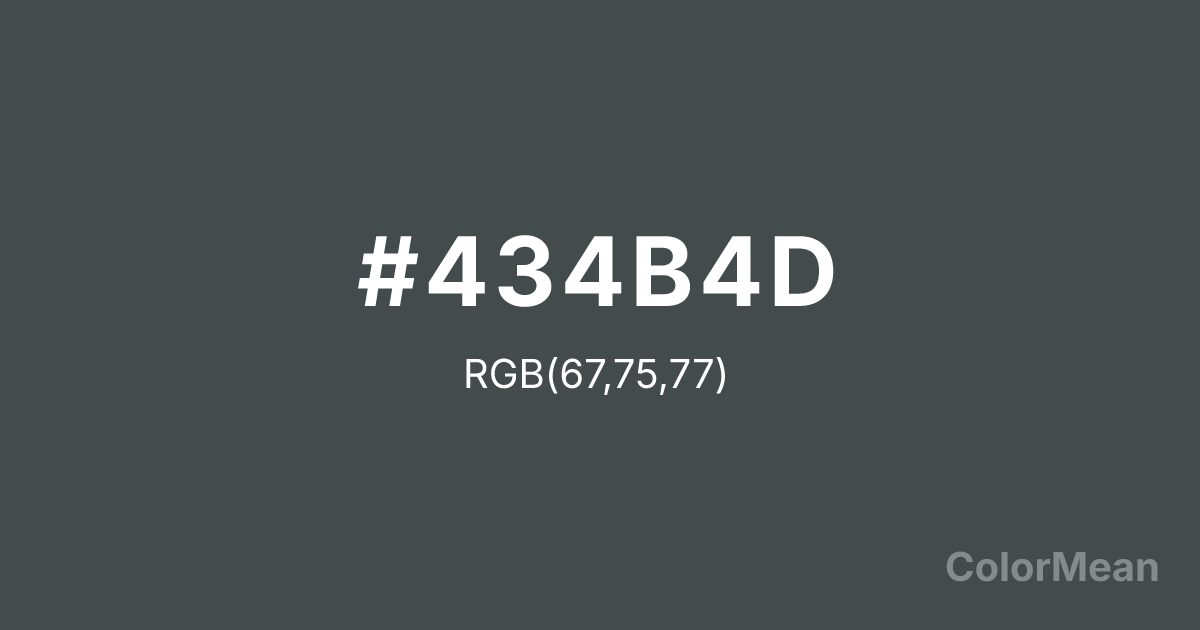 Iron Grey (#434B4D) RGB value is (67, 75, 77). The hex color red value is 67, green is 75, and blue is 77. Its HSL format shows a hue of 192°, saturation of 7 percent, and lightness of 28 percent. The CMYK process values are 13 percent, 3 percent, 0 percent, 70 percent.