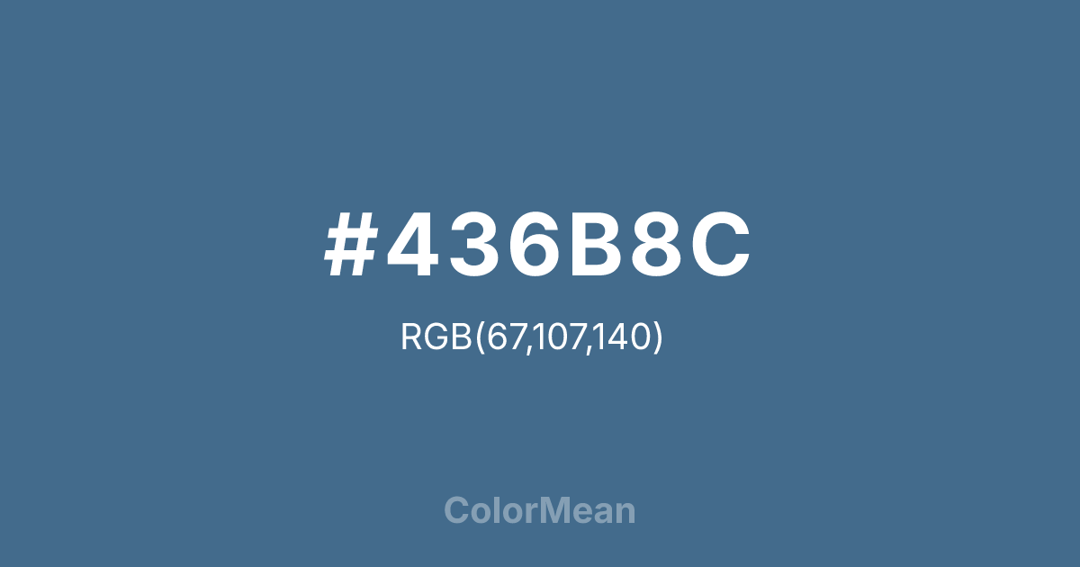 #436B8C RGB value is (67, 107, 140). The hex color red value is 67, green is 107, and blue is 140. Its HSL format shows a hue of 207°, saturation of 35 percent, and lightness of 41 percent. The CMYK process values are 52 percent, 24 percent, 0 percent, 45 percent.