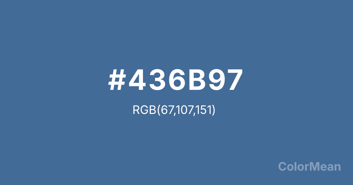 #436B97 RGB value is (67, 107, 151). The hex color red value is 67, green is 107, and blue is 151. Its HSL format shows a hue of 211°, saturation of 39 percent, and lightness of 43 percent. The CMYK process values are 56 percent, 29 percent, 0 percent, 41 percent.