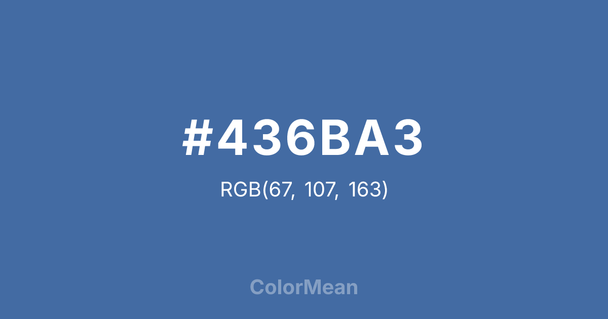 #436BA3 RGB value is (67, 107, 163). The hex color red value is 67, green is 107, and blue is 163. Its HSL format shows a hue of 215°, saturation of 42 percent, and lightness of 45 percent. The CMYK process values are 59 percent, 34 percent, 0 percent, 36 percent.