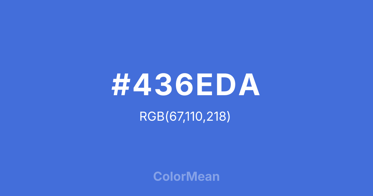 #436EDA RGB value is (67, 110, 218). The hex color red value is 67, green is 110, and blue is 218. Its HSL format shows a hue of 223°, saturation of 67 percent, and lightness of 56 percent. The CMYK process values are 69 percent, 50 percent, 0 percent, 15 percent.