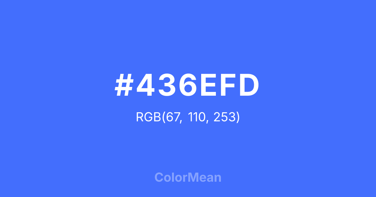 #436EFD RGB value is (67, 110, 253). The hex color red value is 67, green is 110, and blue is 253. Its HSL format shows a hue of 226°, saturation of 98 percent, and lightness of 63 percent. The CMYK process values are 74 percent, 57 percent, 0 percent, 1 percent.
