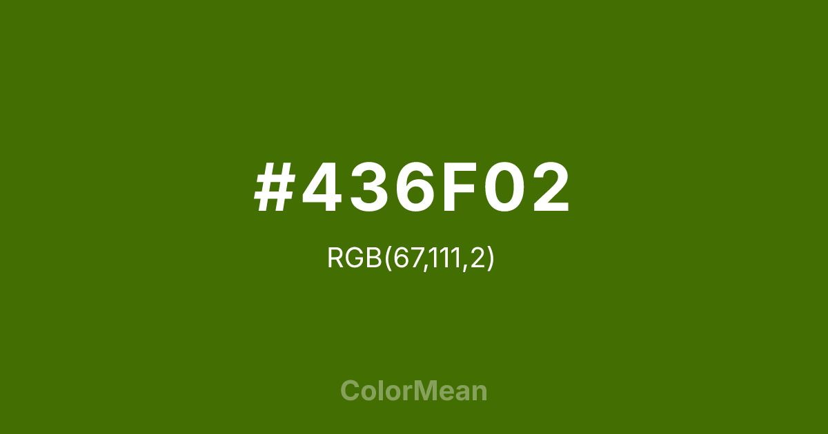 #436F02 RGB value is (67, 111, 2). The hex color red value is 67, green is 111, and blue is 2. Its HSL format shows a hue of 84°, saturation of 96 percent, and lightness of 22 percent. The CMYK process values are 40 percent, 0 percent, 98 percent, 56 percent.