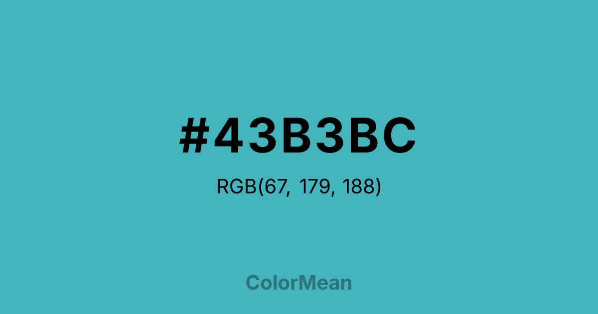 #43B3BC RGB value is (67, 179, 188). The hex color red value is 67, green is 179, and blue is 188. Its HSL format shows a hue of 184°, saturation of 47 percent, and lightness of 50 percent. The CMYK process values are 64 percent, 5 percent, 0 percent, 26 percent.