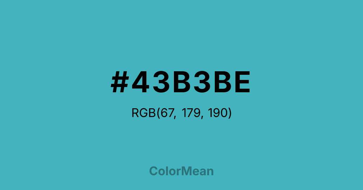 #43B3BE RGB value is (67, 179, 190). The hex color red value is 67, green is 179, and blue is 190. Its HSL format shows a hue of 185°, saturation of 49 percent, and lightness of 50 percent. The CMYK process values are 65 percent, 6 percent, 0 percent, 25 percent.