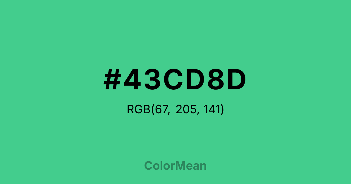 #43CD8D RGB value is (67, 205, 141). The hex color red value is 67, green is 205, and blue is 141. Its HSL format shows a hue of 152°, saturation of 58 percent, and lightness of 53 percent. The CMYK process values are 67 percent, 0 percent, 31 percent, 20 percent.