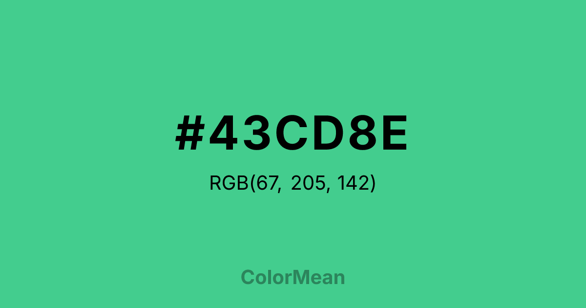 #43CD8E RGB value is (67, 205, 142). The hex color red value is 67, green is 205, and blue is 142. Its HSL format shows a hue of 153°, saturation of 58 percent, and lightness of 53 percent. The CMYK process values are 67 percent, 0 percent, 31 percent, 20 percent.