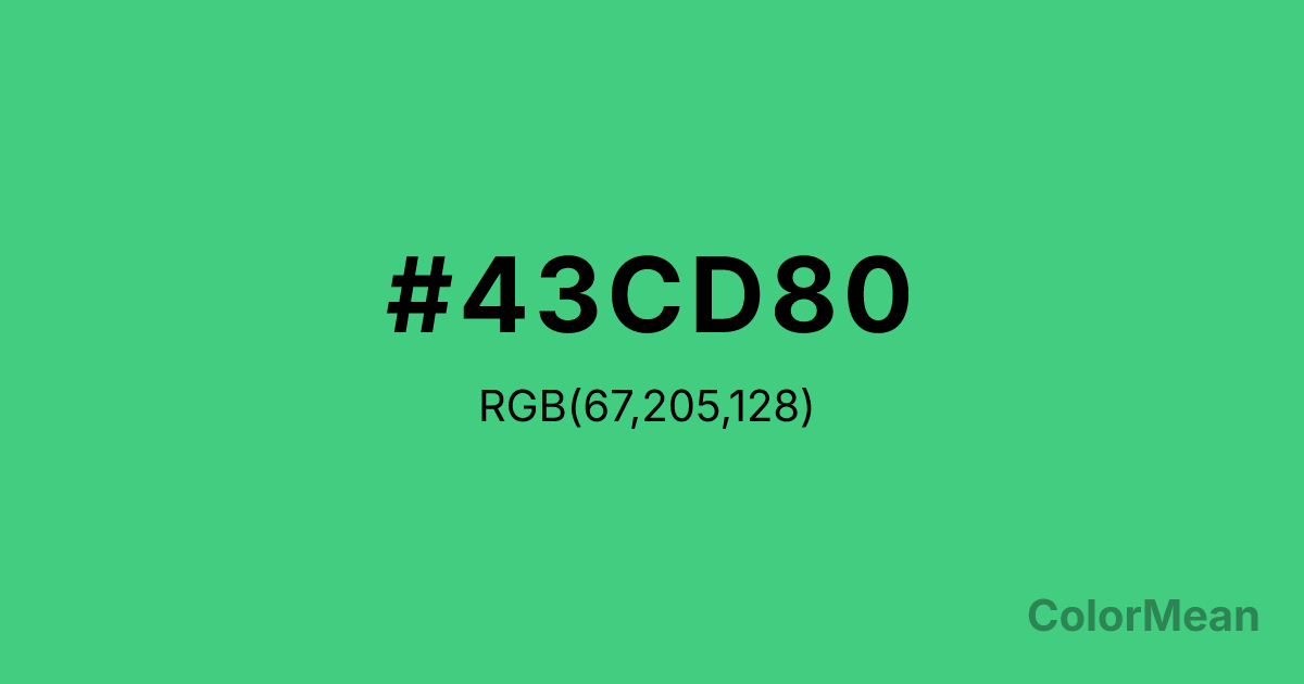 Sea Green 3 (#43CD80) RGB value is (67, 205, 128). The hex color red value is 67, green is 205, and blue is 128. Its HSL format shows a hue of 147°, saturation of 58 percent, and lightness of 53 percent. The CMYK process values are 67 percent, 0 percent, 38 percent, 20 percent.