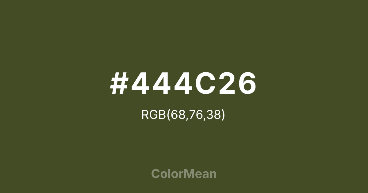 #444C26 RGB value is (68, 76, 38). The hex color red value is 68, green is 76, and blue is 38. Its HSL format shows a hue of 73°, saturation of 33 percent, and lightness of 22 percent. The CMYK process values are 11 percent, 0 percent, 50 percent, 70 percent.