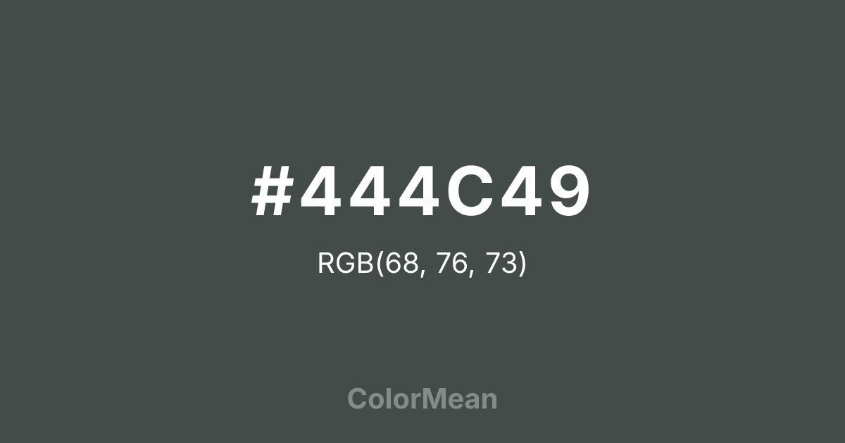 #444C49 RGB value is (68, 76, 73). The hex color red value is 68, green is 76, and blue is 73. Its HSL format shows a hue of 157°, saturation of 6 percent, and lightness of 28 percent. The CMYK process values are 11 percent, 0 percent, 4 percent, 70 percent.