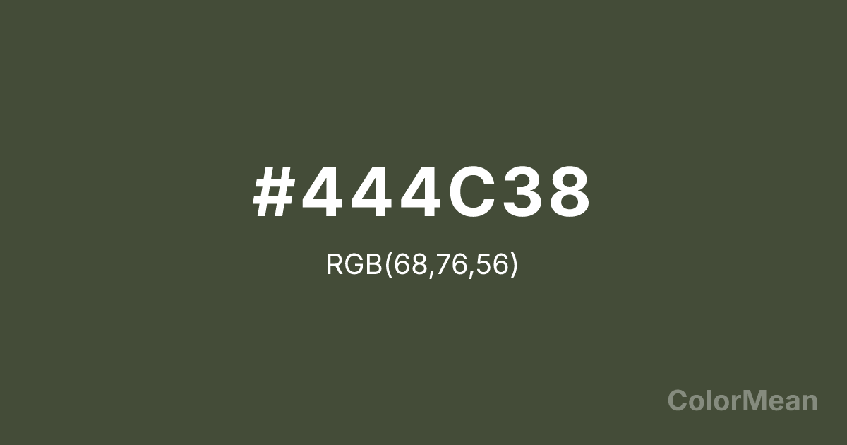 Rifle Green (#444C38) RGB value is (68, 76, 56). The hex color red value is 68, green is 76, and blue is 56. Its HSL format shows a hue of 84°, saturation of 15 percent, and lightness of 26 percent. The CMYK process values are 11 percent, 0 percent, 26 percent, 70 percent.