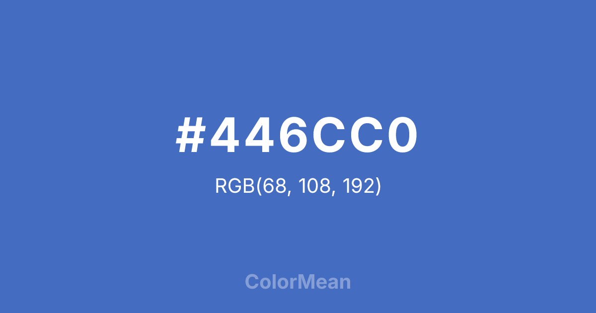 #446CC0 RGB value is (68, 108, 192). The hex color red value is 68, green is 108, and blue is 192. Its HSL format shows a hue of 221°, saturation of 50 percent, and lightness of 51 percent. The CMYK process values are 65 percent, 44 percent, 0 percent, 25 percent.