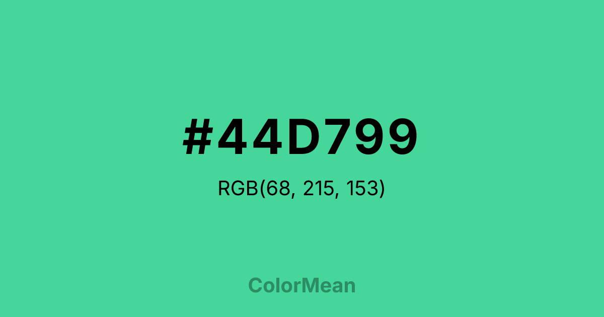 #44D799 RGB value is (68, 215, 153). The hex color red value is 68, green is 215, and blue is 153. Its HSL format shows a hue of 155°, saturation of 65 percent, and lightness of 55 percent. The CMYK process values are 68 percent, 0 percent, 29 percent, 16 percent.