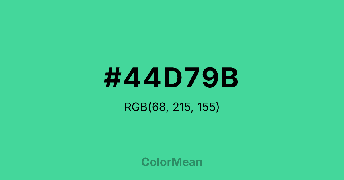 #44D79B RGB value is (68, 215, 155). The hex color red value is 68, green is 215, and blue is 155. Its HSL format shows a hue of 156°, saturation of 65 percent, and lightness of 55 percent. The CMYK process values are 68 percent, 0 percent, 28 percent, 16 percent.