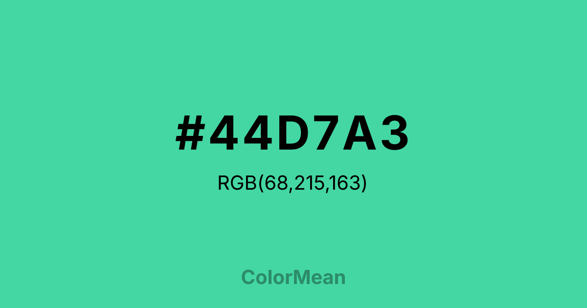 #44D7A3 RGB value is (68, 215, 163). The hex color red value is 68, green is 215, and blue is 163. Its HSL format shows a hue of 159°, saturation of 65 percent, and lightness of 55 percent. The CMYK process values are 68 percent, 0 percent, 24 percent, 16 percent.