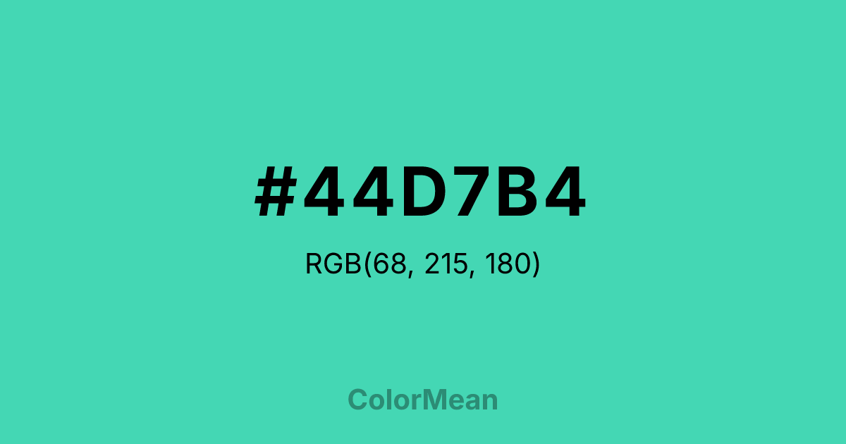 #44D7B4 RGB value is (68, 215, 180). The hex color red value is 68, green is 215, and blue is 180. Its HSL format shows a hue of 166°, saturation of 65 percent, and lightness of 55 percent. The CMYK process values are 68 percent, 0 percent, 16 percent, 16 percent.