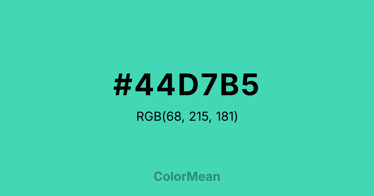 #44D7B5 RGB value is (68, 215, 181). The hex color red value is 68, green is 215, and blue is 181. Its HSL format shows a hue of 166°, saturation of 65 percent, and lightness of 55 percent. The CMYK process values are 68 percent, 0 percent, 16 percent, 16 percent.