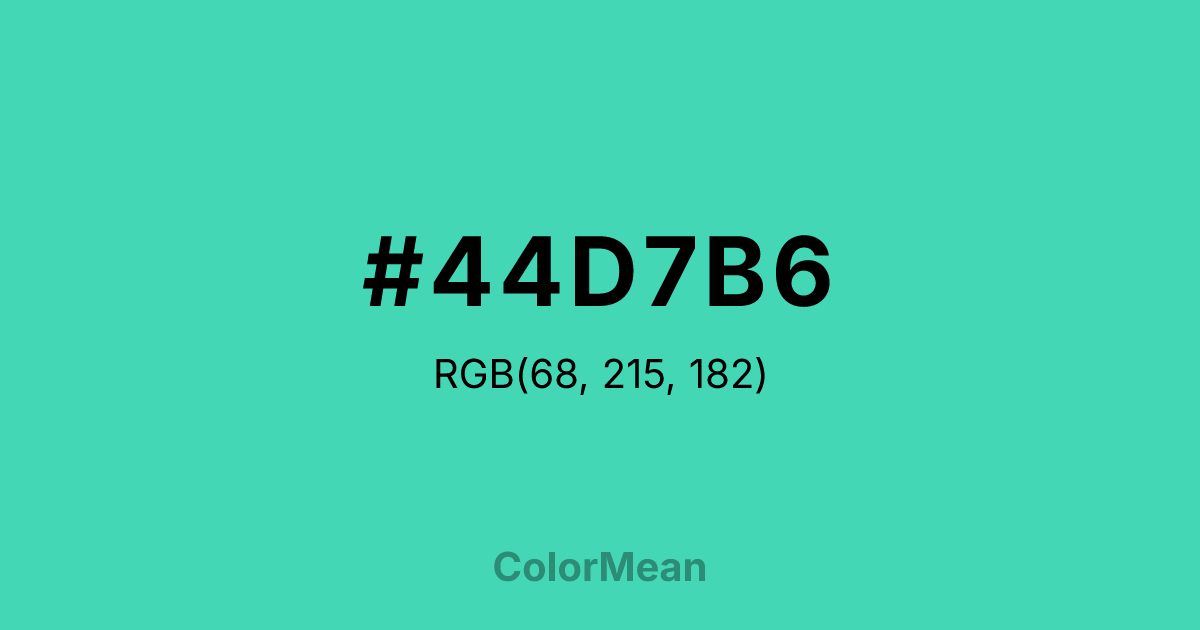 #44D7B6 RGB value is (68, 215, 182). The hex color red value is 68, green is 215, and blue is 182. Its HSL format shows a hue of 167°, saturation of 65 percent, and lightness of 55 percent. The CMYK process values are 68 percent, 0 percent, 15 percent, 16 percent.