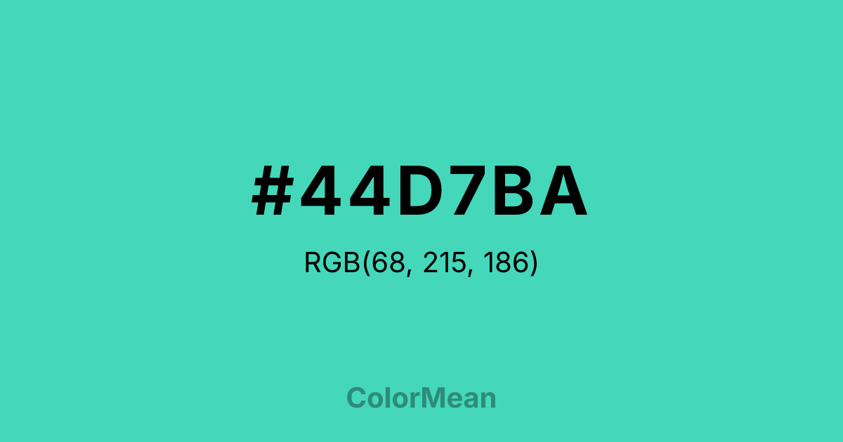 #44D7BA RGB value is (68, 215, 186). The hex color red value is 68, green is 215, and blue is 186. Its HSL format shows a hue of 168°, saturation of 65 percent, and lightness of 55 percent. The CMYK process values are 68 percent, 0 percent, 13 percent, 16 percent.