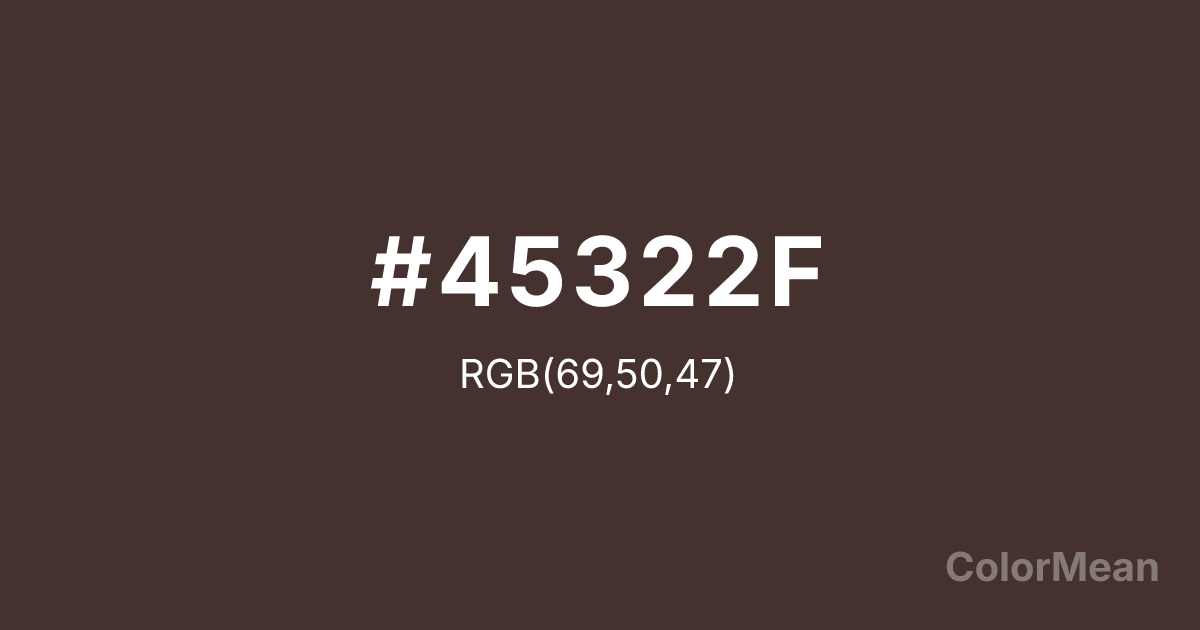 #45322F RGB value is (69, 50, 47). The hex color red value is 69, green is 50, and blue is 47. Its HSL format shows a hue of 8°, saturation of 19 percent, and lightness of 23 percent. The CMYK process values are 0 percent, 28 percent, 32 percent, 73 percent.