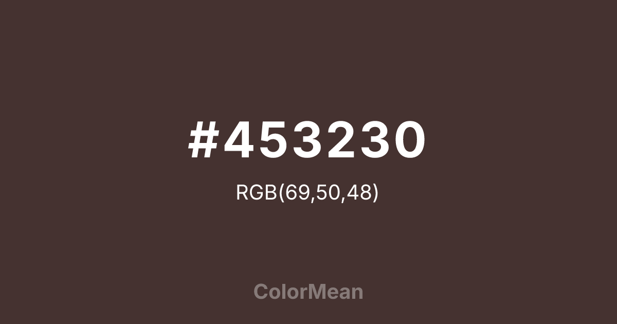 #453230 RGB value is (69, 50, 48). The hex color red value is 69, green is 50, and blue is 48. Its HSL format shows a hue of 6°, saturation of 18 percent, and lightness of 23 percent. The CMYK process values are 0 percent, 28 percent, 30 percent, 73 percent.