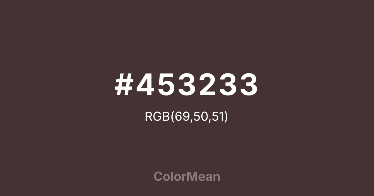 #453233 RGB value is (69, 50, 51). The hex color red value is 69, green is 50, and blue is 51. Its HSL format shows a hue of 357°, saturation of 16 percent, and lightness of 23 percent. The CMYK process values are 0 percent, 28 percent, 26 percent, 73 percent.