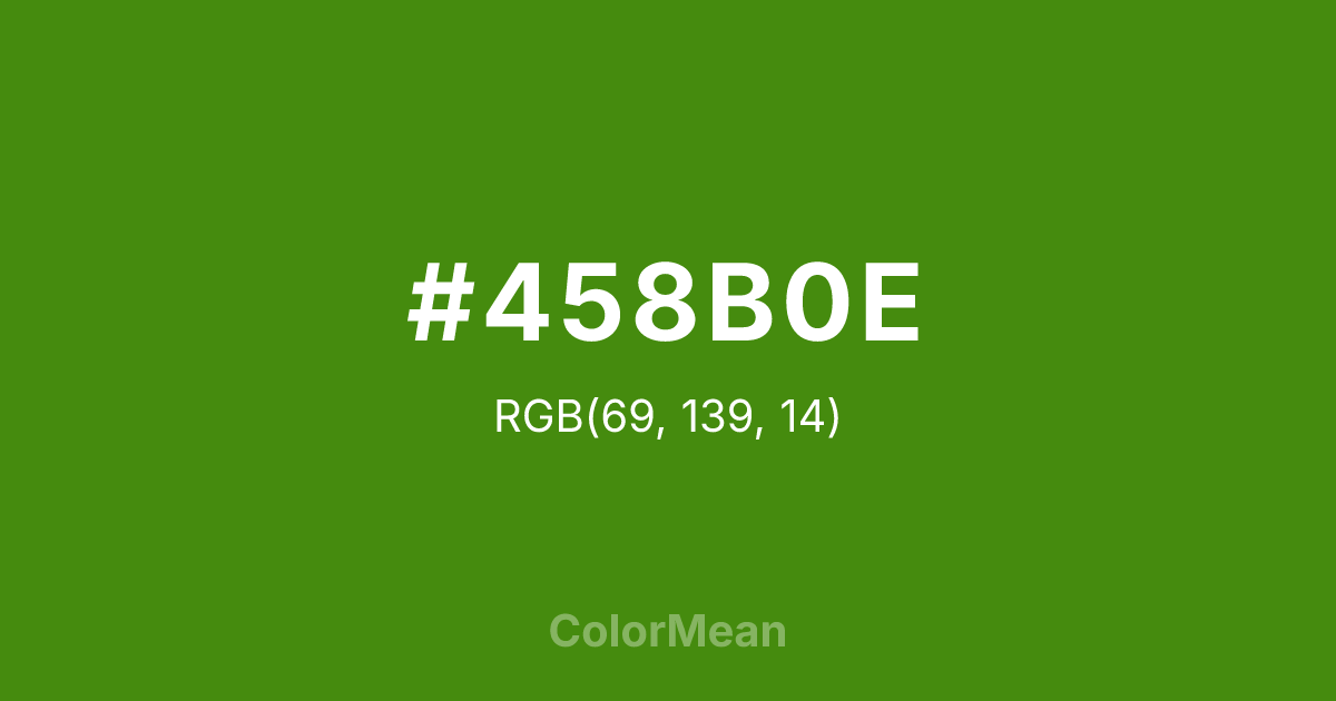 #458B0E RGB value is (69, 139, 14). The hex color red value is 69, green is 139, and blue is 14. Its HSL format shows a hue of 94°, saturation of 82 percent, and lightness of 30 percent. The CMYK process values are 50 percent, 0 percent, 90 percent, 45 percent.
