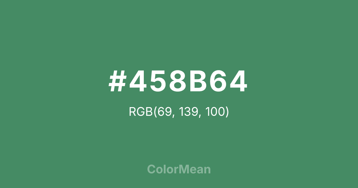 #458B64 RGB value is (69, 139, 100). The hex color red value is 69, green is 139, and blue is 100. Its HSL format shows a hue of 147°, saturation of 34 percent, and lightness of 41 percent. The CMYK process values are 50 percent, 0 percent, 28 percent, 45 percent.