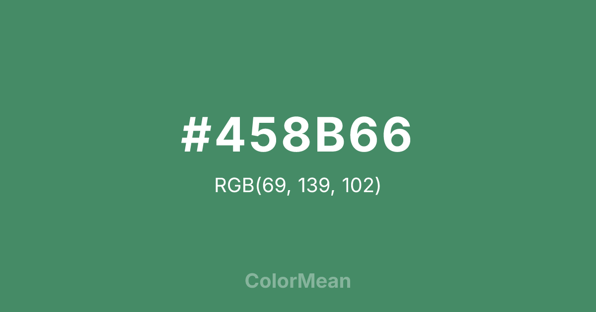 #458B66 RGB value is (69, 139, 102). The hex color red value is 69, green is 139, and blue is 102. Its HSL format shows a hue of 148°, saturation of 34 percent, and lightness of 41 percent. The CMYK process values are 50 percent, 0 percent, 27 percent, 45 percent.