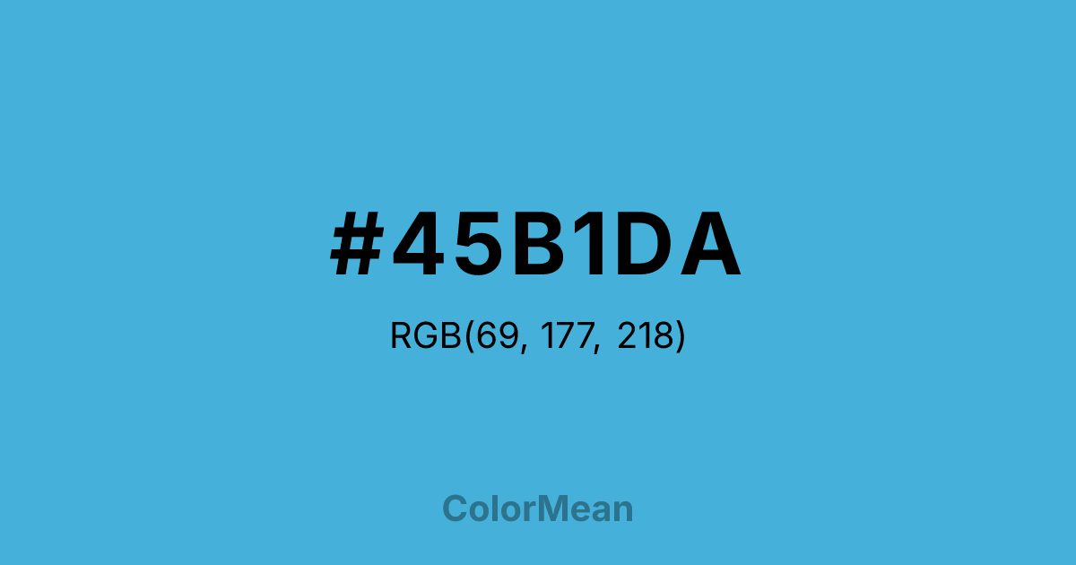 #45B1DA RGB value is (69, 177, 218). The hex color red value is 69, green is 177, and blue is 218. Its HSL format shows a hue of 197°, saturation of 67 percent, and lightness of 56 percent. The CMYK process values are 68 percent, 19 percent, 0 percent, 15 percent.