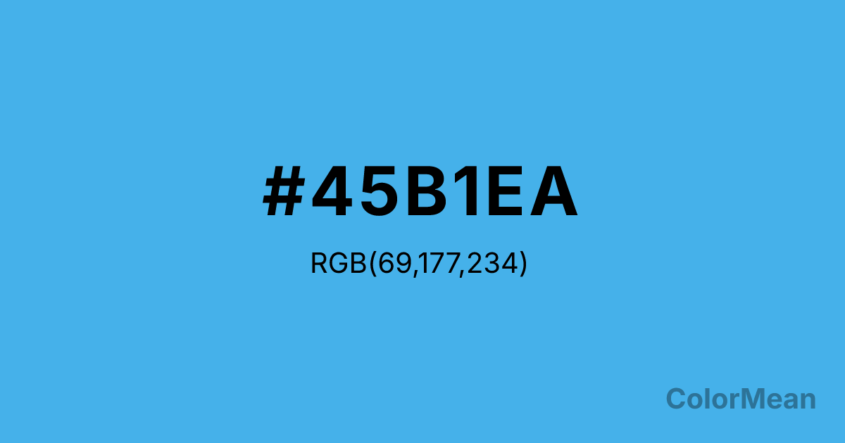 #45B1EA RGB value is (69, 177, 234). The hex color red value is 69, green is 177, and blue is 234. Its HSL format shows a hue of 201°, saturation of 80 percent, and lightness of 59 percent. The CMYK process values are 71 percent, 24 percent, 0 percent, 8 percent.