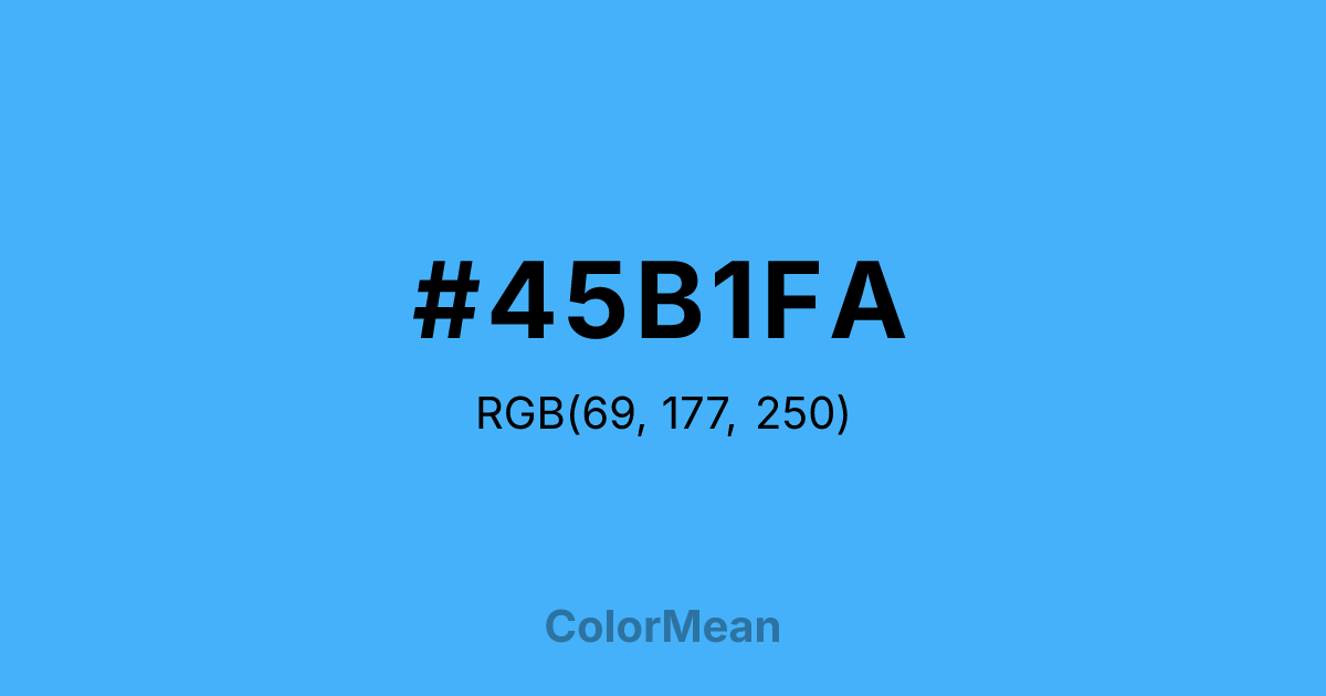 #45B1FA RGB value is (69, 177, 250). The hex color red value is 69, green is 177, and blue is 250. Its HSL format shows a hue of 204°, saturation of 95 percent, and lightness of 63 percent. The CMYK process values are 72 percent, 29 percent, 0 percent, 2 percent.