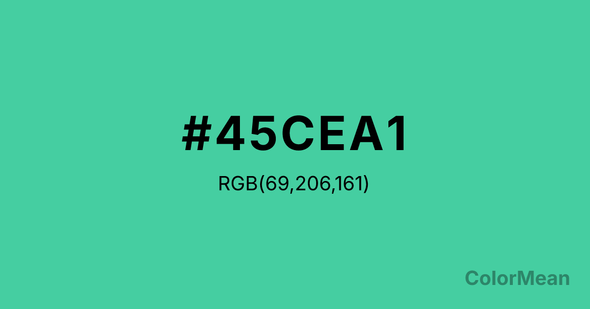 #45CEA1 RGB value is (69, 206, 161). The hex color red value is 69, green is 206, and blue is 161. Its HSL format shows a hue of 160°, saturation of 58 percent, and lightness of 54 percent. The CMYK process values are 67 percent, 0 percent, 22 percent, 19 percent.