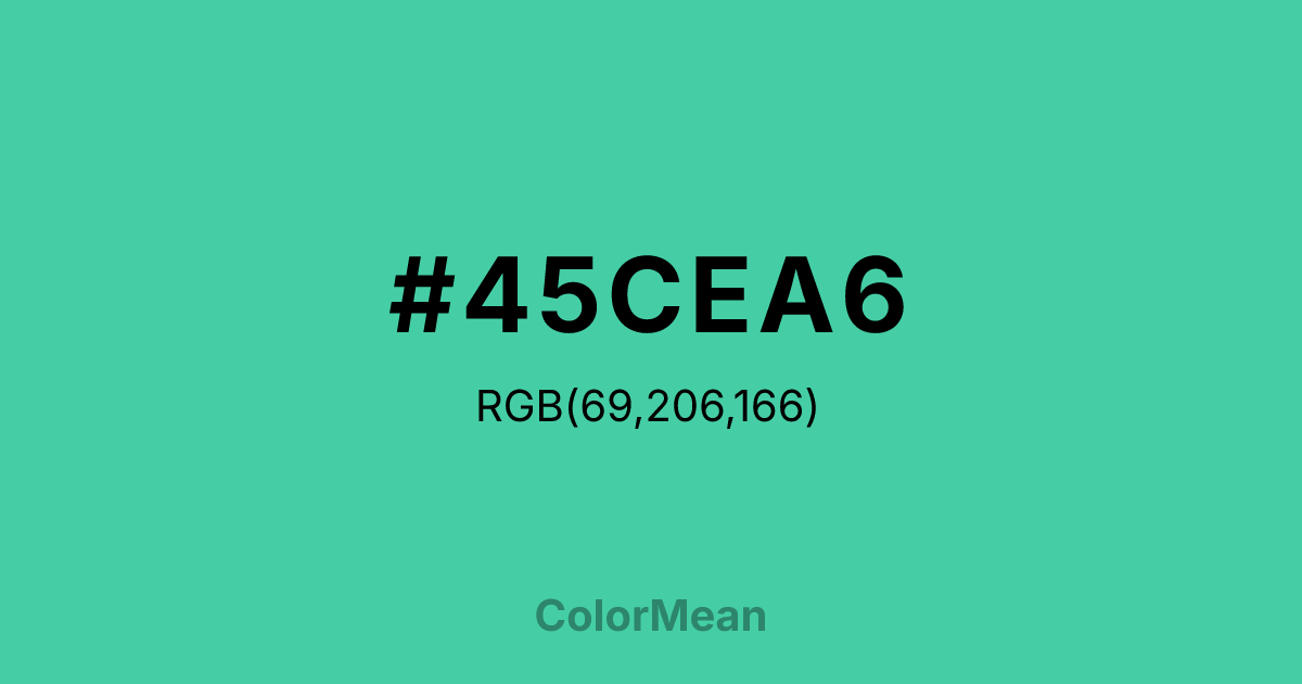 #45CEA6 RGB value is (69, 206, 166). The hex color red value is 69, green is 206, and blue is 166. Its HSL format shows a hue of 162°, saturation of 58 percent, and lightness of 54 percent. The CMYK process values are 67 percent, 0 percent, 19 percent, 19 percent.