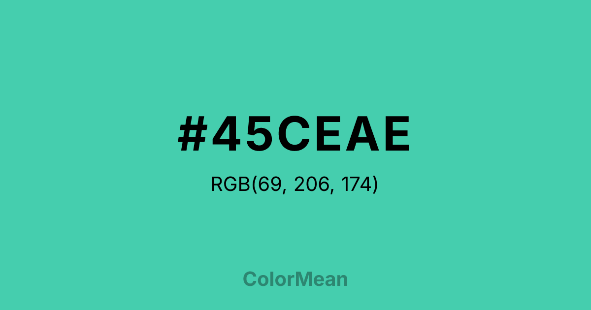 #45CEAE RGB value is (69, 206, 174). The hex color red value is 69, green is 206, and blue is 174. Its HSL format shows a hue of 166°, saturation of 58 percent, and lightness of 54 percent. The CMYK process values are 67 percent, 0 percent, 16 percent, 19 percent.